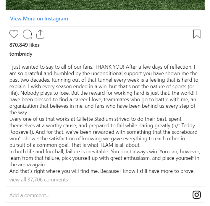 First, what an unusual word he uses in the second sentence. See it? Humbled. HHHumbled. How odd. Then, just after that, in the same sentence he misses a perfect chance to make his post more concise. How unlike Thomas Edward Patrick Brady Jr. to say “you have” instead of you’ve. The Tom I know doesn’t make these mistakes. Maybe he was trying to tell us some by writing out you hAve. Then immediately in the third sentence…”Running”. Why capitalize Running there? What on earth is he trying to tell us? Look down a little further. Tom writes “blessed to find a career I love”. Pretty quick to pull out the L word don’t you think? Must have some really strong feelings to say loVe, unless the L word is just a fill in to fit his greater message. Read on further my young padawan. Tom Terrific starts a sentence with “And”. Sloppy? No, calculated. Now look at the way he capitalizes every letter in team. Another clue? Nope. Oh Tom you tricky little minx, what a classic red herring. Hmm, “football, failure”, we call that alliteration in this business. Don’t be fooled though, take a closer look. There it is, “failuRe”. Now Keep reading, “You don’t always win”. Oh really Tom? You actually do always win. Why lie and write Don’t? Do you see the message yet? Now this final clue will blow your mind. Teddy Roosevelt, an innocent addition right? Wrong, dead wrong. What is Teddy Roosevelt famous for? He’s famous for being a student at Harvard.